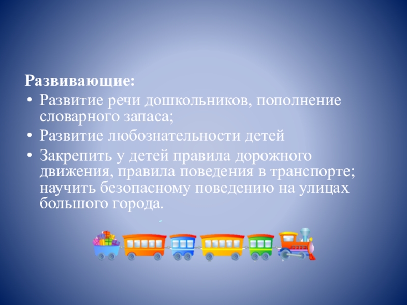 дорожного движения, правила поведения в транспорте; научить безопасному поведению на улицах большого города.