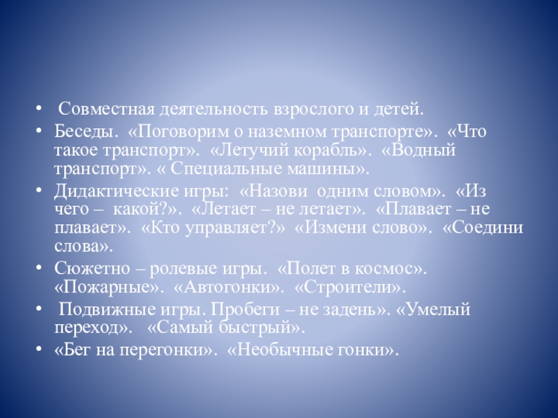 Дидактические игры: «Назови одним словом». «Из чего – какой?». «Летает – не летает». «Плавает – не плавает». «Кто управляет?» «Измени слово». «Соедини слова».