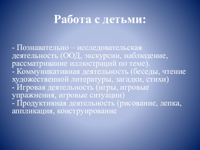 - Познавательно – исследовательская деятельность (ООД, экскурсии, наблюдение, рассматривание