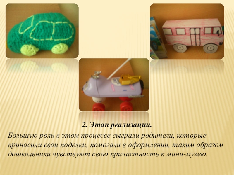2. Этап реализации.Большую роль в этом процессе сыграли родители, которые приносили свои поделки, помогали в оформлении, таким