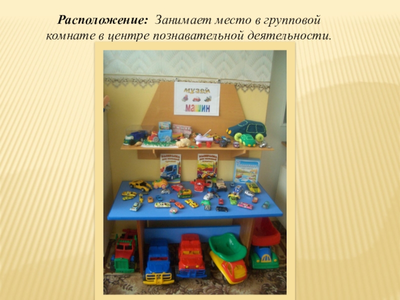 Мини-музеи в группе позволяет нам сделать слово «музей» привычным и привлекательным для детей, он постоянно пополняются новыми машинками, здесь же размещаются детские работы, выполненные совместно со взрослыми. Любая машинка мини-музея может подсказать тему для интересного разговора