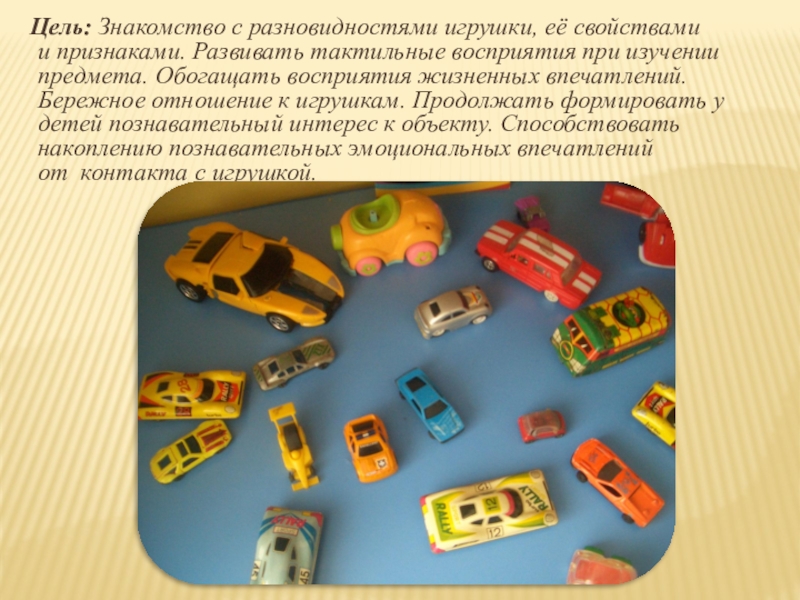 Слайд 3  Цель: Знакомство с разновидностями игрушки, её свойствами и признаками. Развивать тактильные