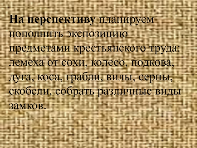 На перспективу планируем пополнить экспозицию предметами крестьянского труда: лемеха от сохи,