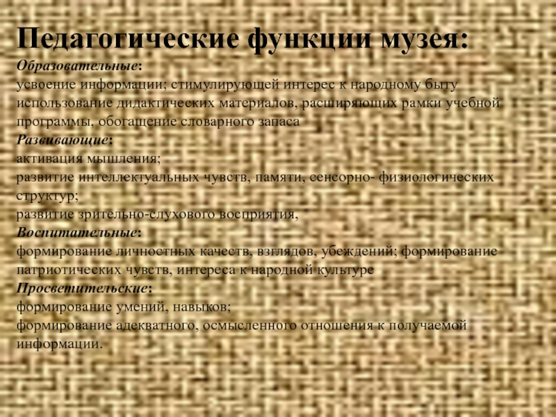 Слайд 6Педагогические функции музея: