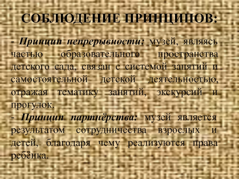 Слайд 5- Принцип непрерывности: музей, являясь частью образовательного пространства детского сада, связан