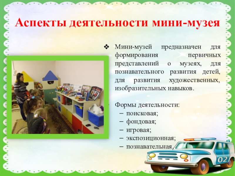 Мини-музей предназначен для формирования первичных представлений о музеях, для