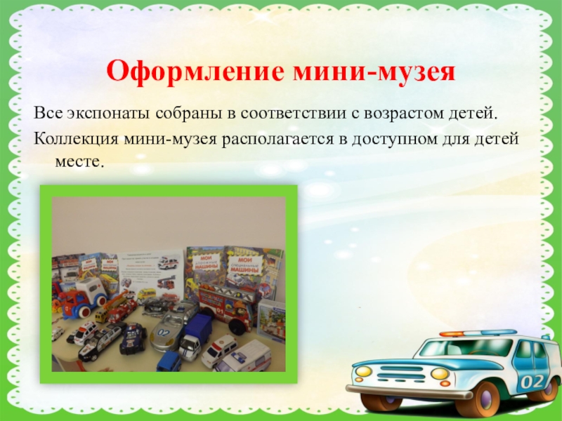 Оформление мини-музея: музейные экспонаты собраны в соответствии с возрастом детей. Коллекции мини-музея располагаются на полках стенки в групповой комнате.