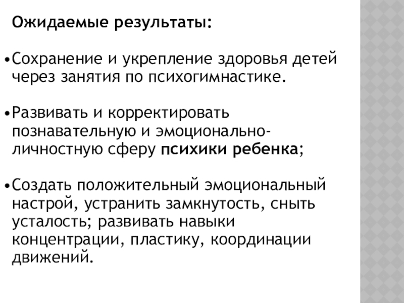 Не менее важно использовать психогимнастику в профилактической работе с практически здоровыми детьми с целью психофизической разрядки.