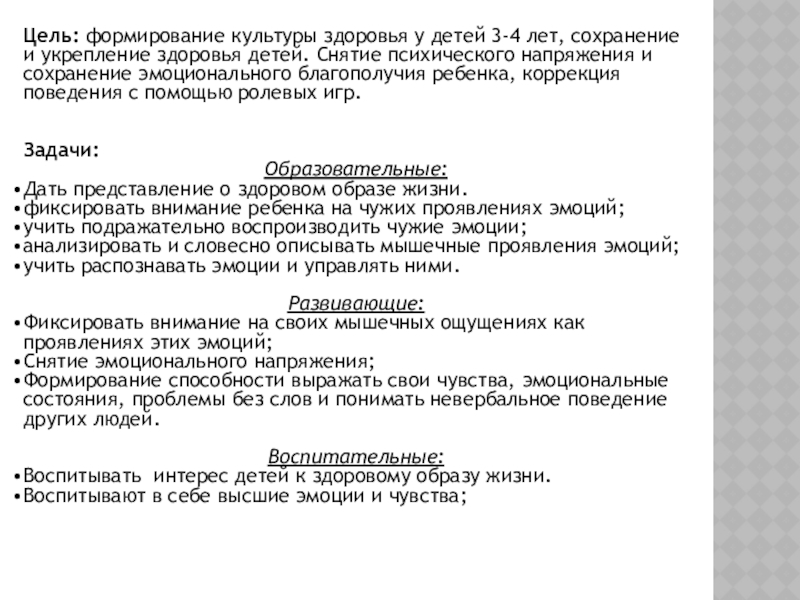 Слайд 4Цель: формирование культуры здоровья у детей 3-4 лет, сохранение и укрепление