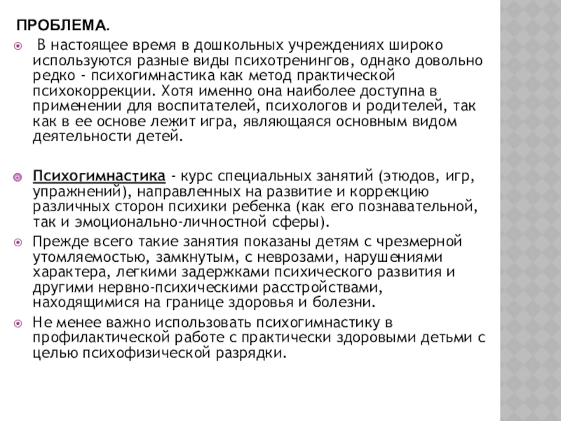 психотренингов, однако довольно редко - психогимнастика как метод практической психокоррекции. Хотя именно она наиболее доступна в применении для воспитателей, психологов и родителей, так как в ее основе лежит игра, являющаяся основным видом деятельности детей.
