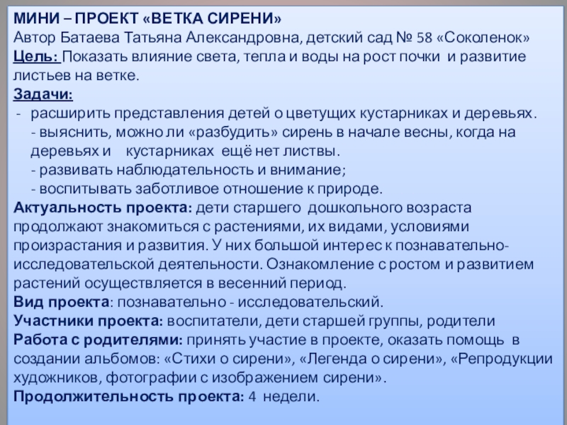 Актуальность проекта: дети старшего дошкольного возраста продолжают знакомиться с растениями, их видами, условиями произрастания и развития. У них большой интерес к познавательно-исследовательской деятельности. Ознакомление с ростом и развитием растений осуществляется в весенний период. Вид проекта: познавательно - исследовательский. Участники проекта: воспитатели, дети старшей группы, родители Работа с родителями: принять участие в проекте, оказать помощь в создании альбомов: «Стихи о сирени», «Легенда о сирени», «Репродукции художников, фотографии с изображением сирени». Продолжительность проекта: 4 недели.