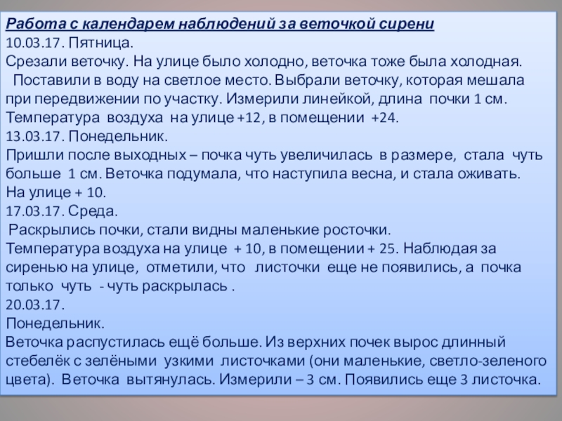 Слайд 4Работа с календарем наблюдений за веточкой сирени