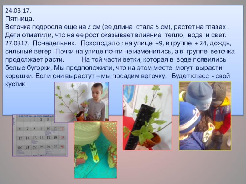 27.0317. Понедельник. Похолодало : на улице +9, в группе + 24, дождь, сильный ветер. Почки на улице почти не изменились, а в группе веточка продолжает расти. На той части ветки, которая в воде появились белые бугорки. Мы предположили, что на этом месте могут вырасти корешки. Если они вырастут – мы посадим веточку. Будет класс - свой кустик.