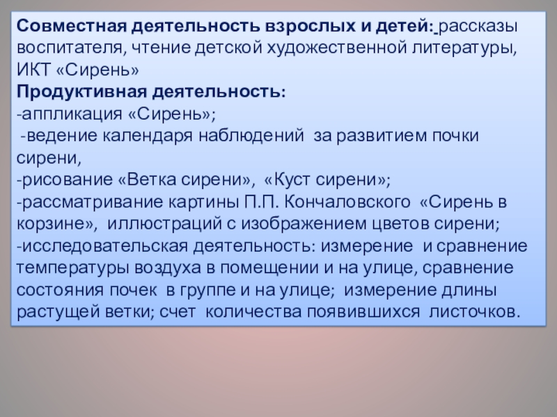 -ведение календаря наблюдений за развитием почки сирени, -рисование «Ветка сирени», «Куст сирени»; -рассматривание картины П.П. Кончаловского «Сирень в корзине», иллюстраций с изображением цветов сирени; -исследовательская деятельность: измерение и сравнение температуры воздуха в помещении и на улице, сравнение состояния почек в группе и на улице; измерение длины растущей ветки; счет количества появившихся листочков.