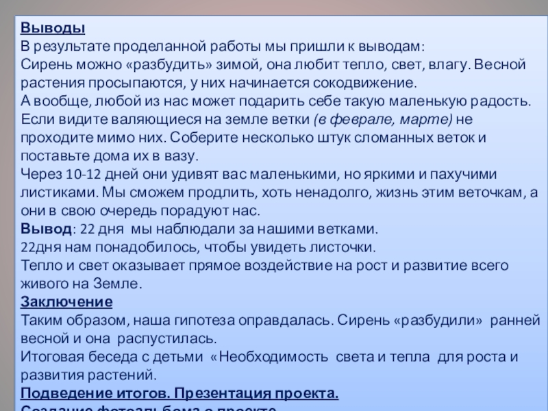 Таким образом, наша гипотеза оправдалась. Сирень «разбудили» ранней весной и она распустилась. Итоговая беседа с детьми «Необходимость света и тепла для роста и развития растений.