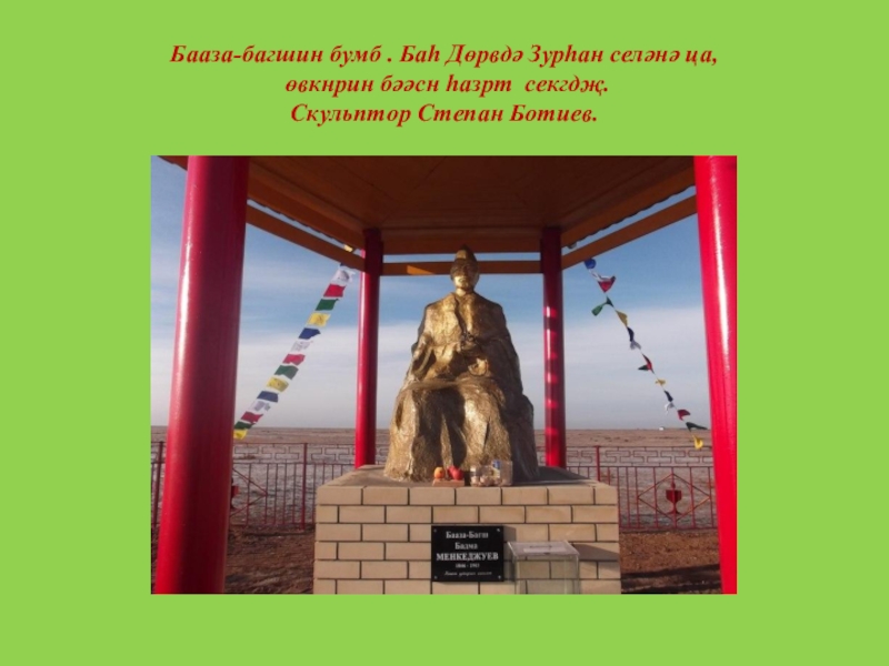 Бааза-багшин бумб . Баһ Дөрвдә Зурһан селәнә ца,  өвкнрин бәәсн һазрт секгдҗ. Скульптор Степан Ботиев.