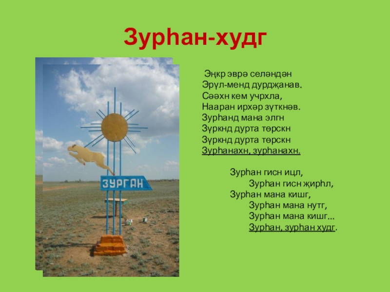 Зурһан-худг Эңкр эврә селәндәнЭрүл-менд дурдҗанав.Сәәхн кем учрхла,Нааран ирхәр зүткнәв.Зурһанд мана элгнЗүркнд дурта төрскнЗүркнд дурта төрскнЗурһанахн, зурһанахн.  Зурһан гисн ицл, Зурһан гисн җирһл,