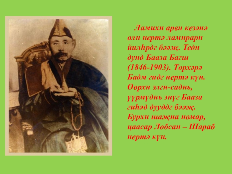 Ламихн арвн кезәнә олн нертә ламнрарн йилһрдг бәәҗ. Тедн дунд Бааза Багш (1846-1903). Төрхәрә Бадм