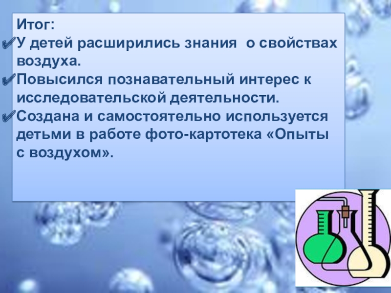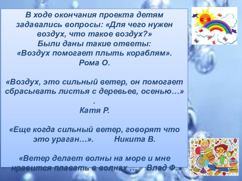 Слайд 13В ходе окончания проекта детям задавались вопросы: «Для чего нужен воздух,