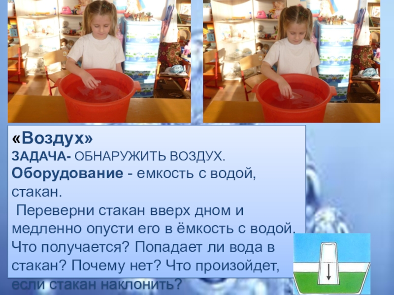 дном и медленно опусти его в ёмкость с водой. Что получается? Попадает ли вода в стакан? Почему нет? Что произойдет, если стакан наклонить?