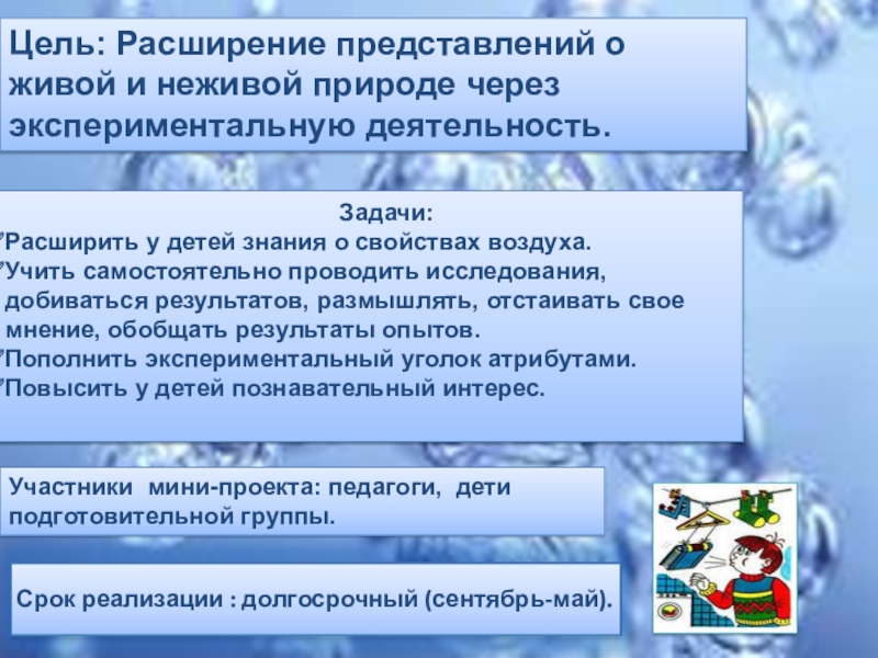 Цель: Расширение представлений о живой и неживой природе через экспериментальную деятельность.