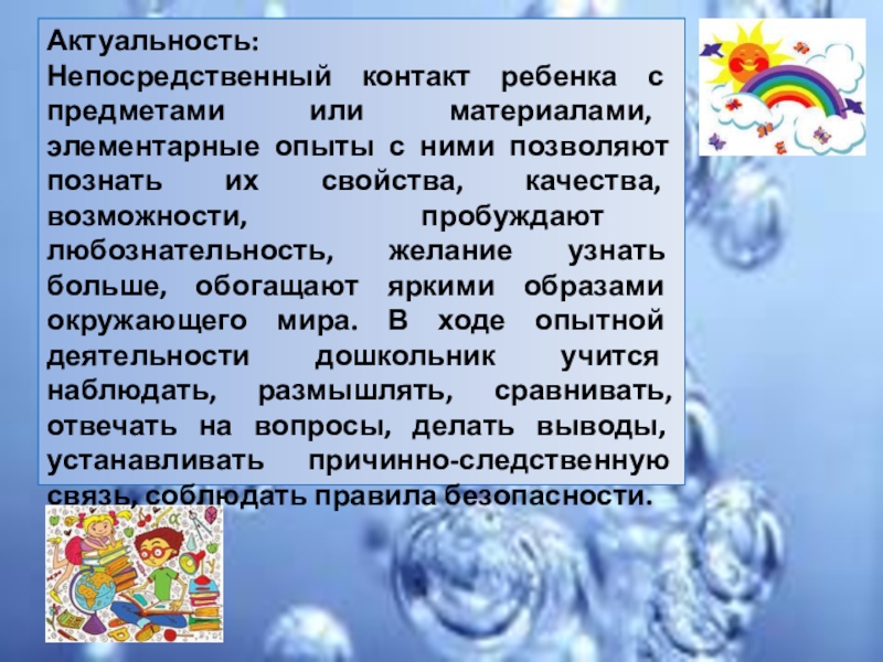 позволяют познать их свойства, качества, возможности, пробуждают любознательность, желание узнать больше, обогащают яркими образами окружающего мира. В ходе опытной деятельности дошкольник учится наблюдать, размышлять, сравнивать, отвечать на вопросы, делать выводы, устанавливать причинно-следственную связь, соблюдать правила безопасности.