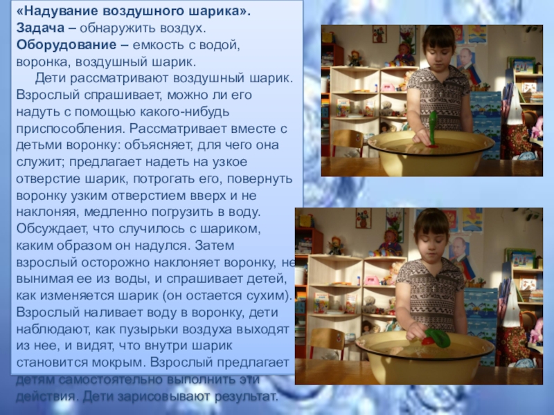 Дети рассматривают воздушный шарик. Взрослый спрашивает, можно ли его надуть с помощью какого-нибудь приспособления. Рассматривает вместе с детьми воронку: объясняет, для чего она служит; предлагает надеть на узкое отверстие шарик, потрогать его, повернуть воронку узким отверстием вверх и не наклоняя, медленно погрузить в воду. Обсуждает, что случилось с шариком, каким образом он надулся. Затем взрослый осторожно наклоняет воронку, не вынимая ее из воды, и спрашивает детей, как изменяется шарик (он остается сухим). Взрослый наливает воду в воронку, дети наблюдают, как пузырьки воздуха выходят из нее, и видят, что внутри шарик становится мокрым. Взрослый предлагает детям самостоятельно выполнить эти действия. Дети зарисовывают результат.