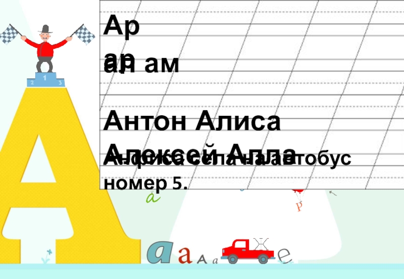 Ар арал ам  Антон Алиса Алексей Алла  Анфиса села на автобус номер 5.