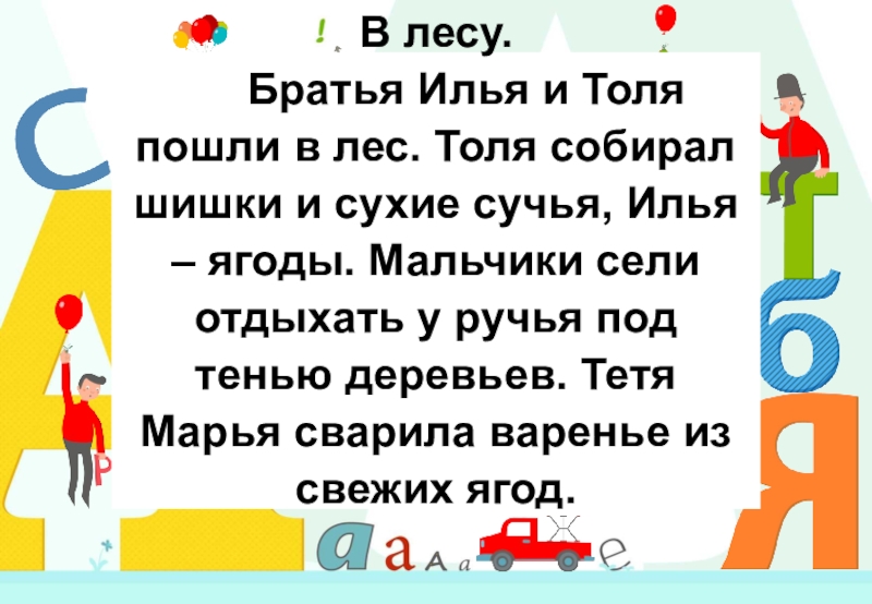 Слайд 13В лесу.      Братья Илья и Толя пошли в лес. Толя