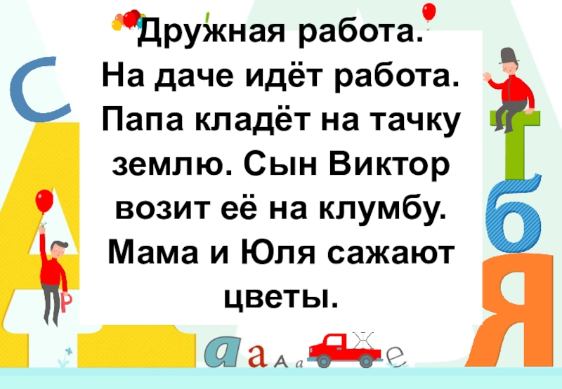 Слайд 10Дружная работа. На даче идёт работа. Папа кладёт на тачку землю. Сын
