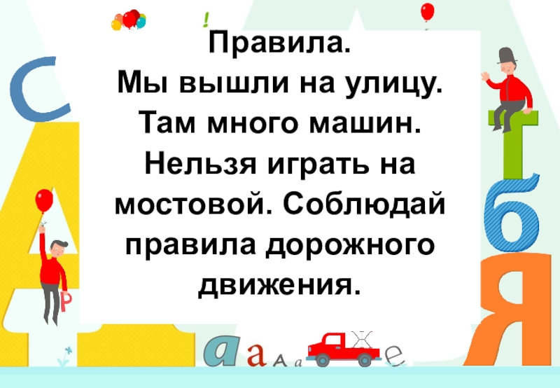 Слайд 12Правила. Мы вышли на улицу. Там много машин. Нельзя играть на