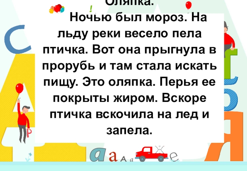 Слайд 14Оляпка.      Ночью был мороз. На льду реки весело пела птичка.