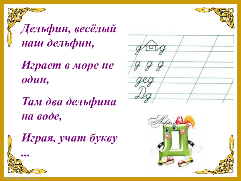 Дельфин, весёлый наш дельфин,Играет в море не один,Там два дельфина на воде,Играя, учат букву ...