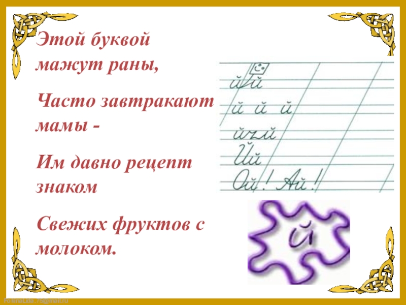 Этой буквой мажут раны,Часто завтракают мамы -Им давно рецепт знакомСвежих фруктов с молоком.