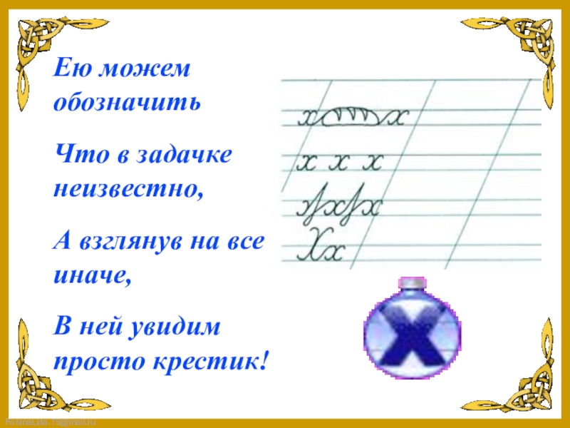 Ею можем обозначитьЧто в задачке неизвестно,А взглянув на все иначе,В ней увидим просто крестик!
