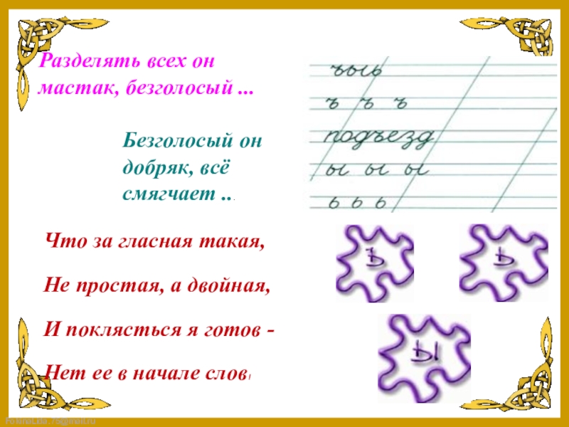 Разделять всех он мастак, безголосый ...Безголосый он добряк, всё смягчает ...Что за гласная такая,Не простая, а двойная,И
