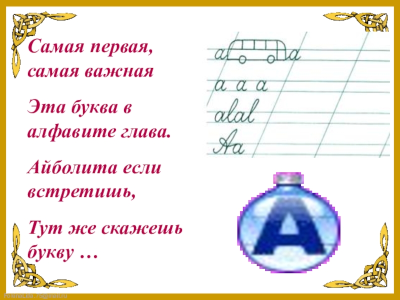 Самая первая, самая важнаяЭта буква в алфавите глава.Айболита если встретишь,Тут же скажешь букву …