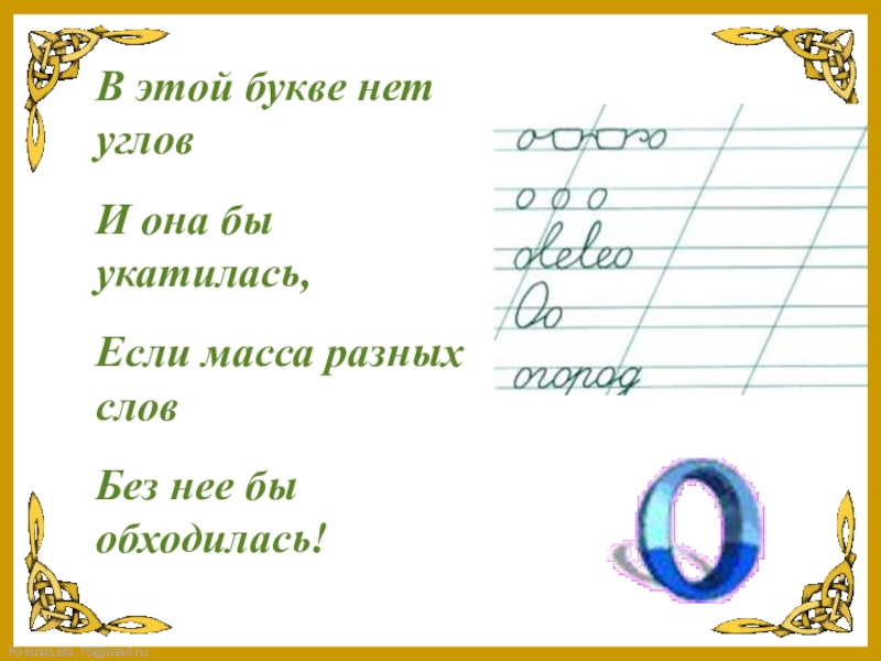 В этой букве нет угловИ она бы укатилась,Если масса разных словБез нее бы обходилась!