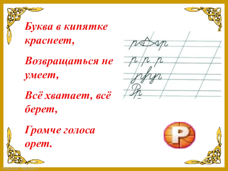 Букву «П» перевернули,Справа хвостик пристегнули,Завернули на конце,Получили букву ...