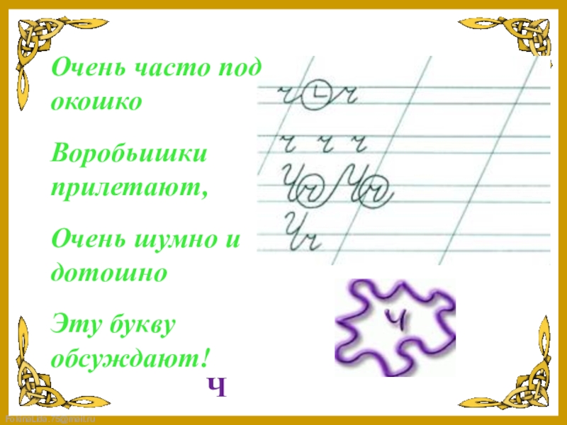 Очень часто под окошкоВоробьишки прилетают,Очень шумно и дотошноЭту букву обсуждают!Ч