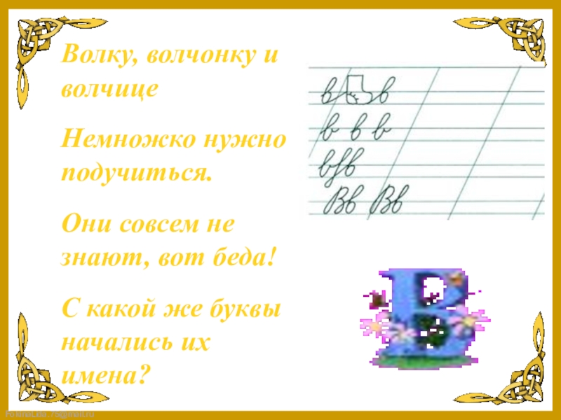 Волку, волчонку и волчицеНемножко нужно подучиться.Они совсем не знают, вот беда!С какой же буквы начались их имена?
