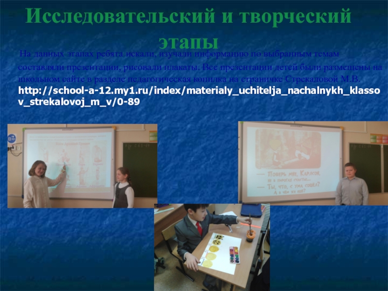 информацию по выбранным темам составляли презентации, рисовали плакаты. Все презентации детей были размещены на школьном сайте в разделе педагогическая копилка на страничке Стрекаловой М.В. http://school-a-12.my1.ru/index/materialy_uchitelja_nachalnykh_klassov_strekalovoj_m_v/0-89