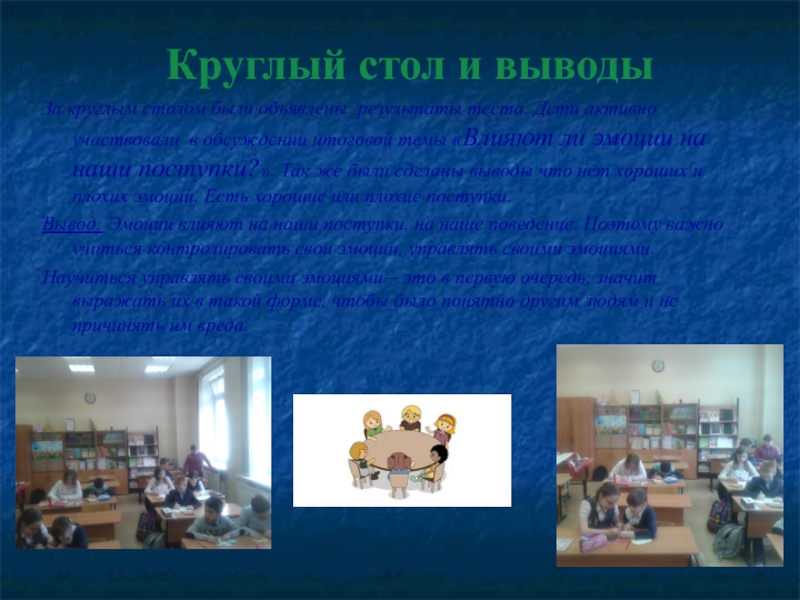 Круглый стол и выводы За круглым столом были объявлены результаты теста. Дети активно участвовали в обсуждении итоговой