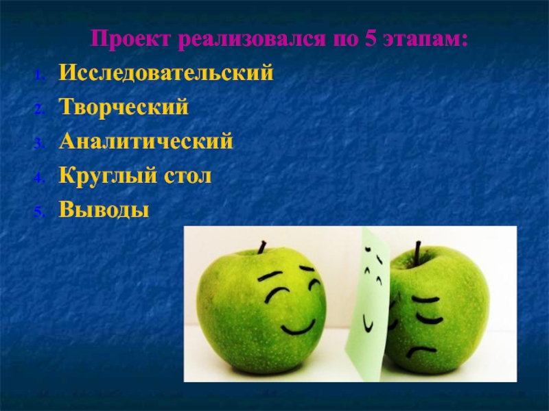 Проект реализовался по 5 этапам:ИсследовательскийТворческийАналитическийКруглый столВыводы
