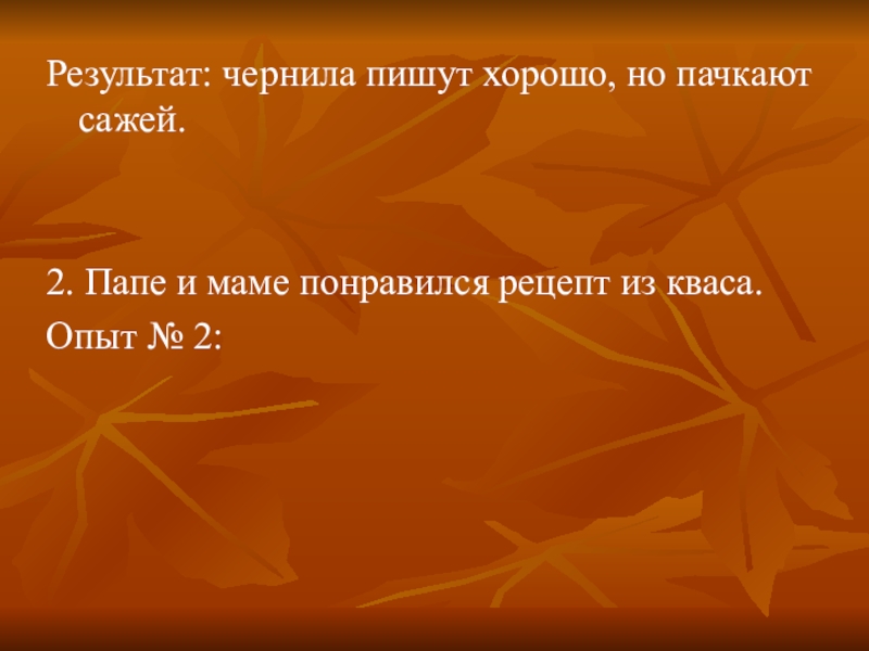 Слайд 13Результат: чернила пишут хорошо, но пачкают сажей.
