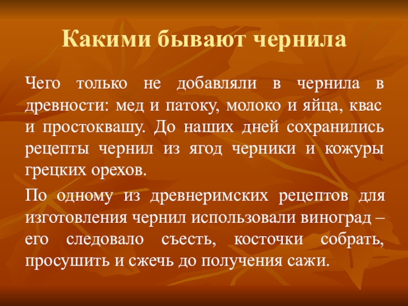 и патоку, молоко и яйца, квас и простоквашу. До наших дней сохранились рецепты чернил из ягод черники и кожуры грецких орехов.
