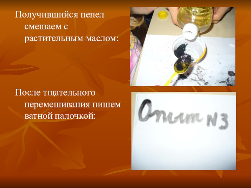 Слайд 17Получившийся пепел смешаем с растительным маслом: