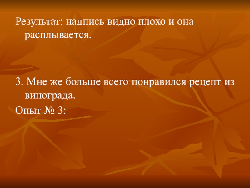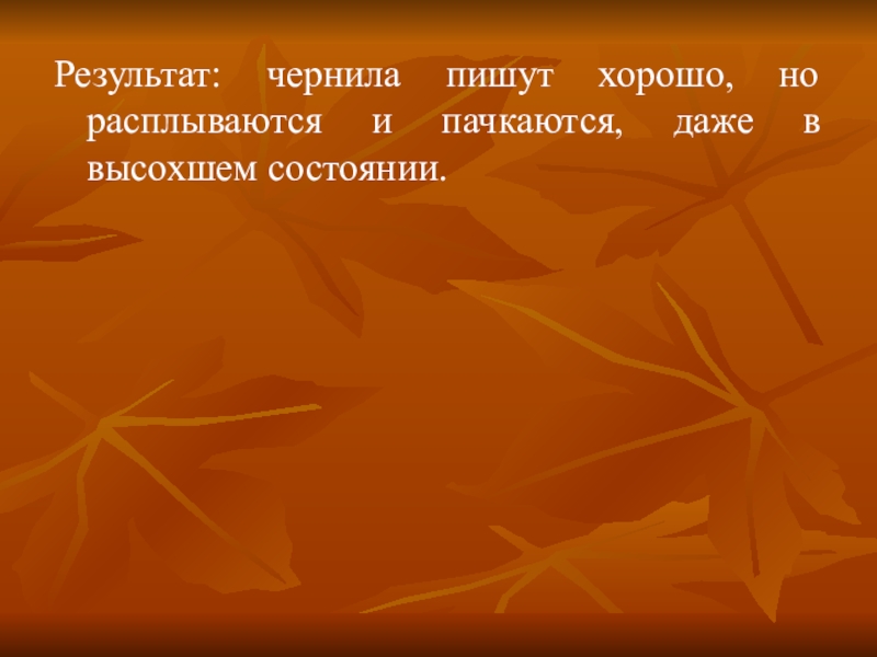Слайд 18Результат: чернила пишут хорошо, но расплываются и пачкаются, даже в высохшем