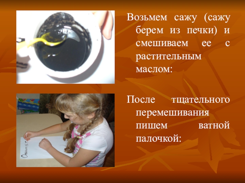 Слайд 12Возьмем сажу (сажу берем из печки) и смешиваем ее с растительным