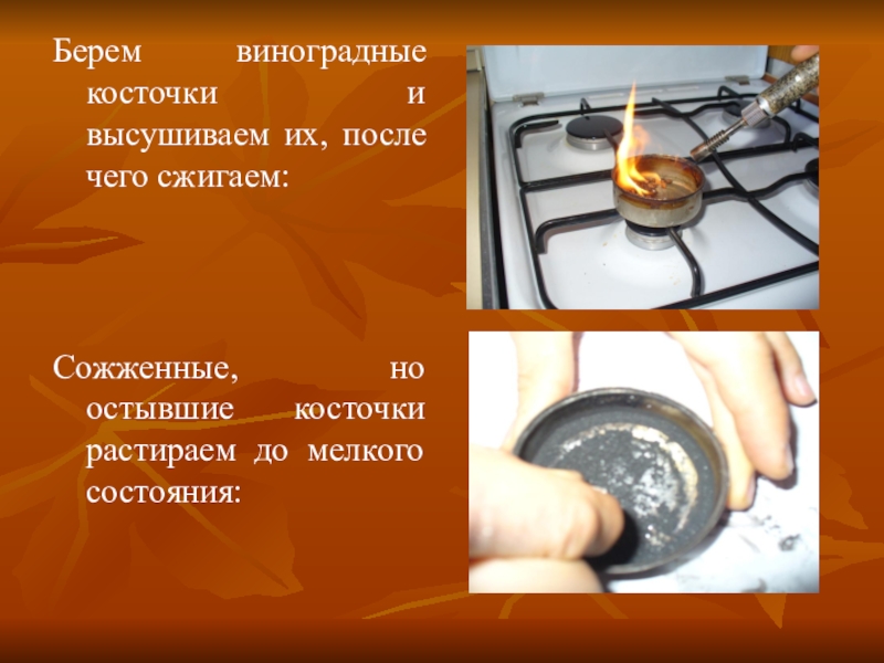 Слайд 16Берем виноградные косточки и высушиваем их, после чего сжигаем: